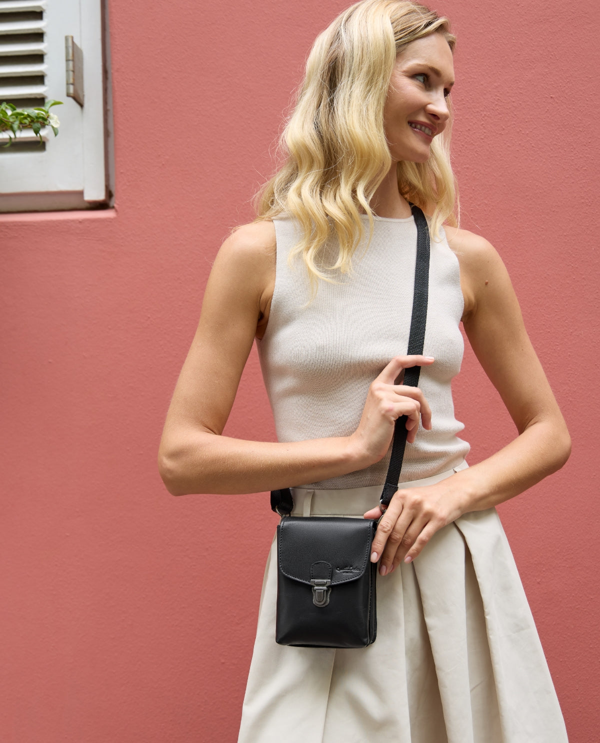 Ben je geen fan van grote tassen en draag je je essentiële spullen graag dicht bij je lichaam? "Nelly" is een heel bijzondere hulp, omdat ze er niet uitziet als een klassieke buik- of heuptas. Met haar praktische hoekige ontwerp ondersteunt ze je op festivals, in clubs en bij andere grote evenementen en is ze inmiddels gewoonweg onmisbaar geworden. Haar trendy vintage look in een minimalistisch ontwerp maakt deze compacte heuptas van hoogwaardig verwerkt geitenleer tot een stijlvolle metgezel, waarmee je zonder problemen de drukte voor het podium trotseert, elke moshpit doorstaat of gewoon ontspannen naar de klanken van je favoriete band kunt luisteren, zonder bang te hoeven zijn dat een dief met je spullen aan de haal gaat.