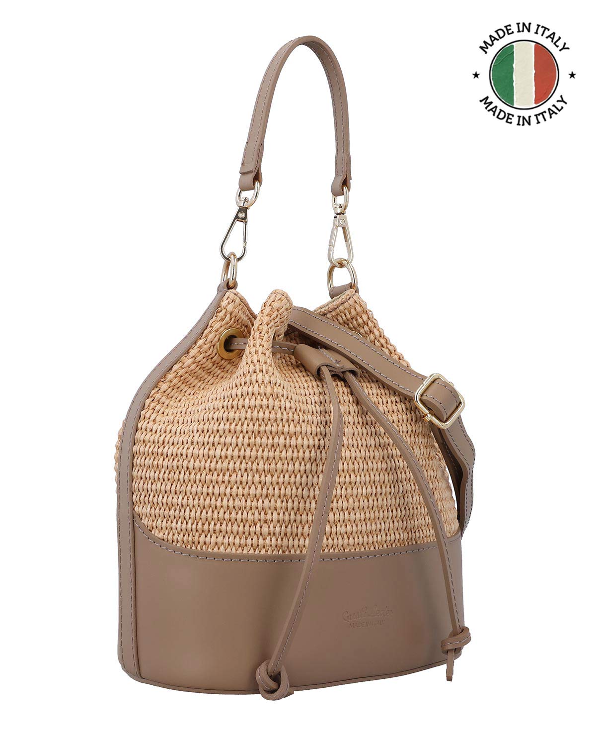 De "Nuria" bucket bag combineert tijdloze elegantie met doordachte functionaliteit. Haar fijn geweven raffia-materiaal geeft haar een natuurlijke lichtheid: raffia wordt gewonnen uit de vezels van een palmsoort, is bijzonder robuust en tegelijkertijd aangenaam flexibel – ideaal voor een tas die je stijlvol door het dagelijks leven begeleidt. De gladde leren bodem en de leren details zorgen voor extra stabiliteit en duurzaamheid. Het buiten geprente "Made in Italy"-logo (niet verguld) voegt een subtiel, hoogwaardig accent toe en onderstreept de moderne vintage-charme van de tas.
