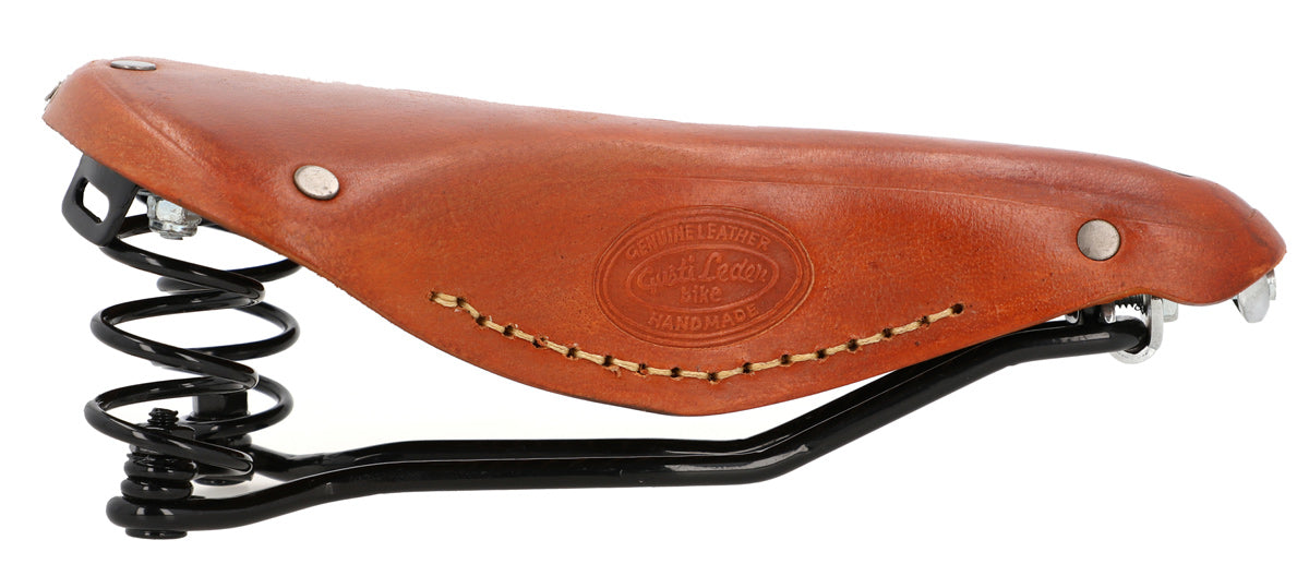 Net als onze andere retrozadels in het Gusti assortiment, heeft de slijtvaste "Michael M" vanwege zijn extreem robuuste karakter wat tijd nodig om in te worden ingereden, maar beloont je dan met een eenmalige, perfect op maat gemaakte pasvorm. Net als bij een leren schoen, die zich na verloop van tijd aan je voet aanpast, geeft het zadel mee en wordt dan individueel op jou afgestemd. Met een beetje regelmatige leerverzorging zul je jarenlang plezier hebben van het retro zadel "Michael M."!