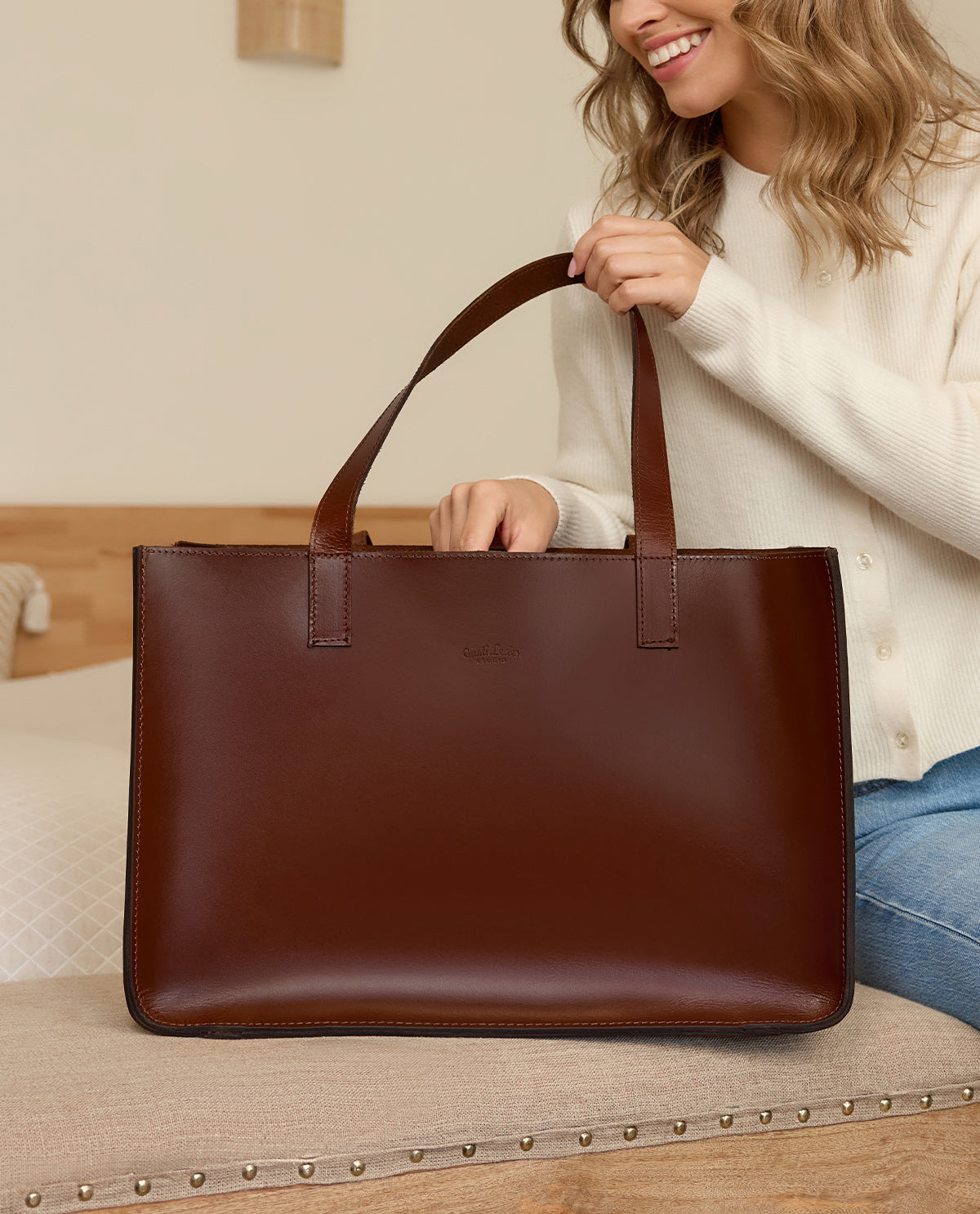 Das extragroße Innenfach von Agatha hat genug Raum für dein 15 Zoll Notebook, deine Trinkflasche, Geldbörse, Notizbücher, Schlüssel und Stifteetui. Zudem bietet die große Öffnung genügend Stauraum für einen spontanen Einkauf. Die Tragehenkel aus echtem Leder runden das Design ab, während die Möglichkeit, Agatha mit einer Widmung zu versehen, sie zu einem besonders persönlichen Geschenk macht. Diese Tasche wird nicht nur deinem Alltag gerecht, sondern unterstützt auch eine Branche, die sich für Umweltschutz und faire Arbeitspraktiken einsetzt. Ein Must-Have für alle, die Funktionalität und Stil vereinen möchten.