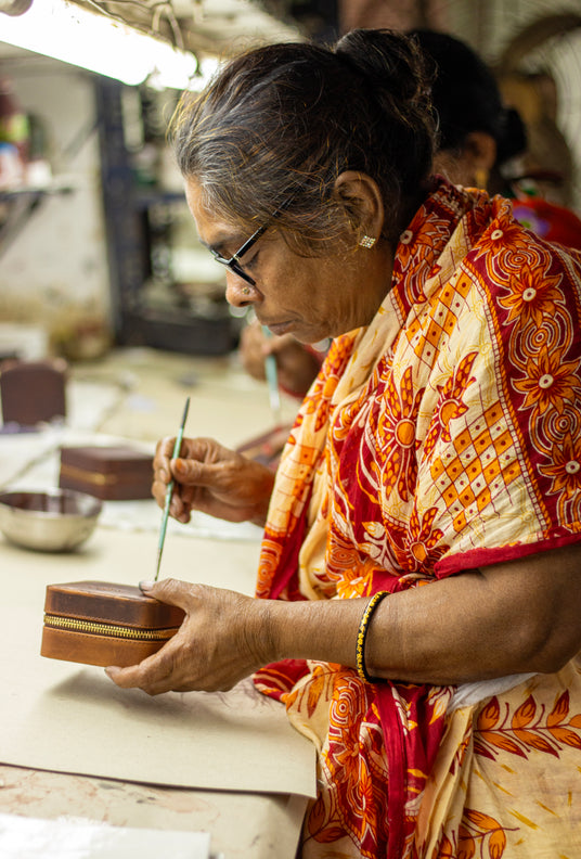 Diese Verantwortung beginnt lange bevor ein Produkt in Deine Hände gelangt. Gusti Leder verzichtet konsequent auf Zwischenhändler und arbeitet direkt und partnerschaftlich mit Produzenten in Indien zusammen, die wir regelmäßig persönlich besuchen. Besonders wichtig ist uns dabei der respektvolle Umgang mit allen Mitarbeitenden: faire Löhne, sichere Arbeitsbedingungen und die klare Zusicherung, dass Kinderarbeit ausgeschlossen ist. Wir verstehen Verantwortung nicht als Zusatz, sondern als festen Bestandteil unserer Philosophie. Darum ist Transparenz für uns auch kein leeres Wort, sondern tägliche Praxis: Wir gehen offen damit um, woher unser Leder stammt, wie es verarbeitet wird und welche Werte unseren Entscheidungen zugrunde liegen.