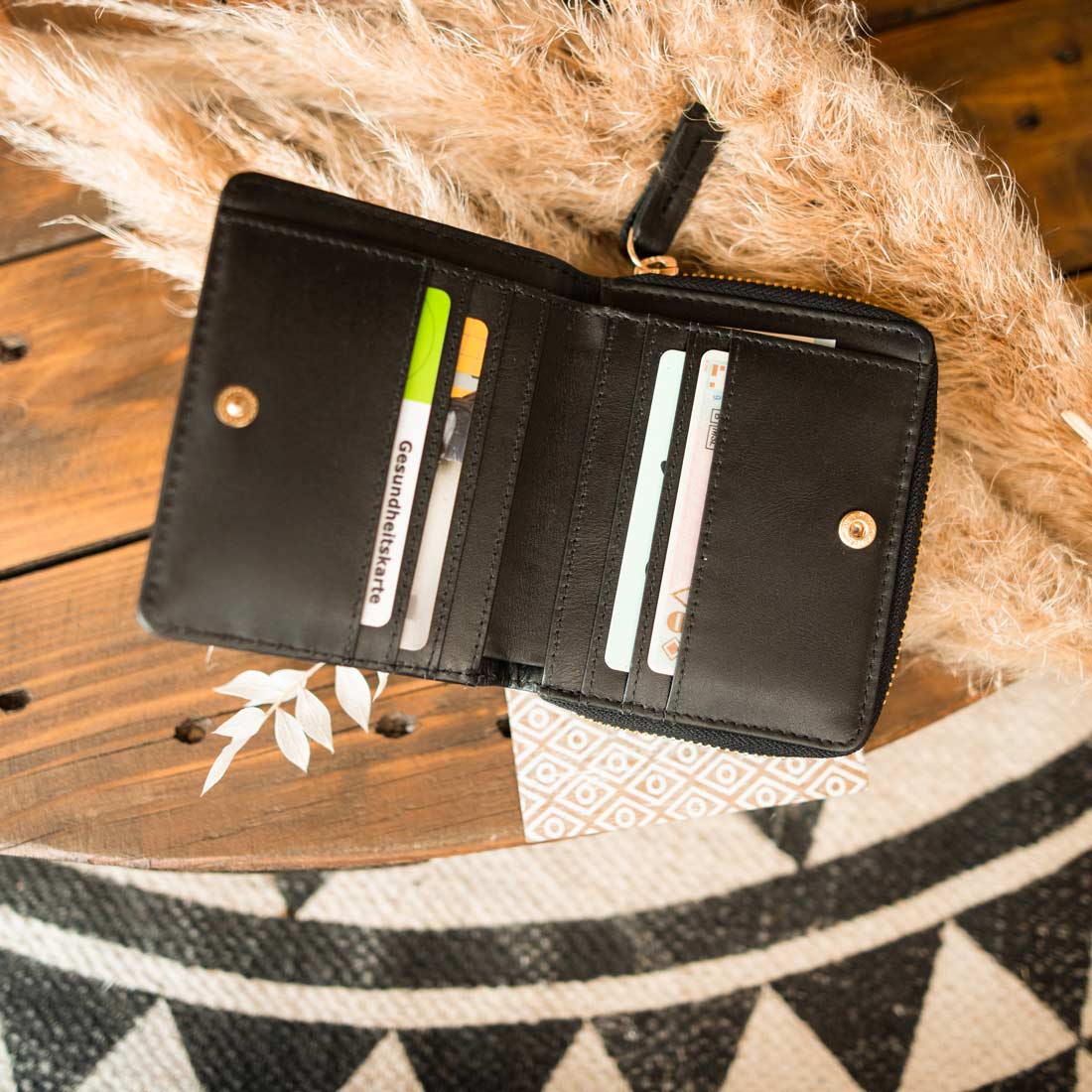Im Inneren verfügt „Monika“ über ein großes Münzfach mit zwei Fächern, sodass du den größtmöglichen Platz rausholen kannst. Das Highlight bietet aber sicherlich das aufklappbare Kartenfach mit Platz für bis zu 8 Karten samt Einlegefach für deine Geldscheine.Der große Reißverschluss schützt dabei dein Hab und Gut perfekt, sodass auch nichts rausfallen kann. Ab in die Tasche und los geht’s – mit „Monika“!