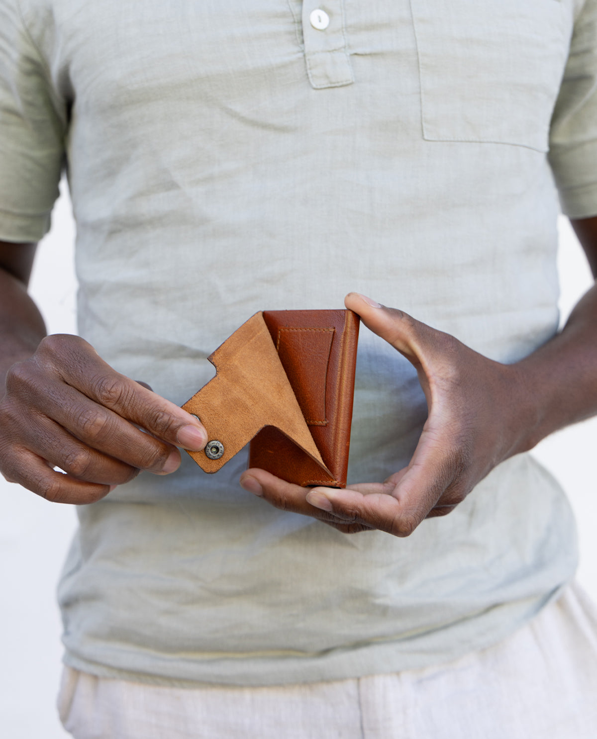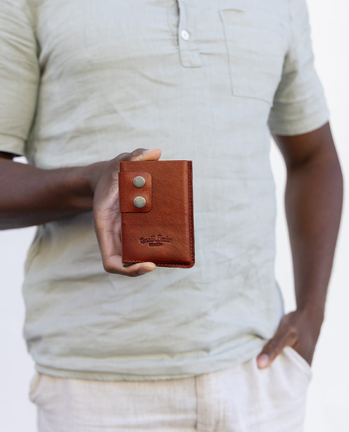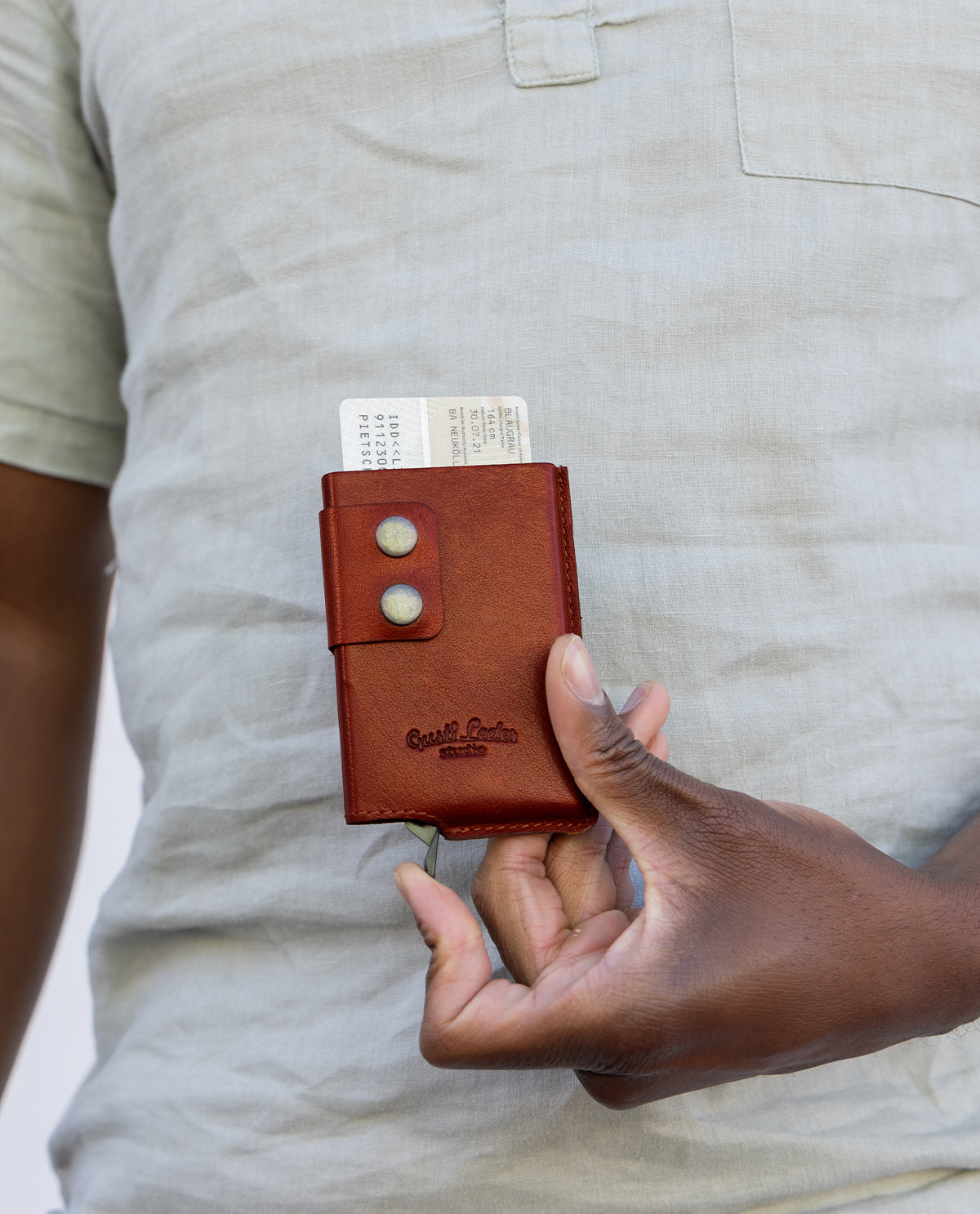 Das braune Portemonnaie „Tilo“ ist eine Geldbörse für Herren, die Sicherheit und klare Struktur miteinander verbindet. Zwei Druckknopfverschlüsse sorgen für festen Halt und ein sicheres Verschließen im Alltag. Der integrierte automatische Pop-up-Mechanismus bringt Deine Karten auf Knopfdruck übersichtlich nach oben und ermöglicht schnellen Zugriff. „Tilo“ wirkt reduziert, funktional und passt mühelos in jede Tasche.