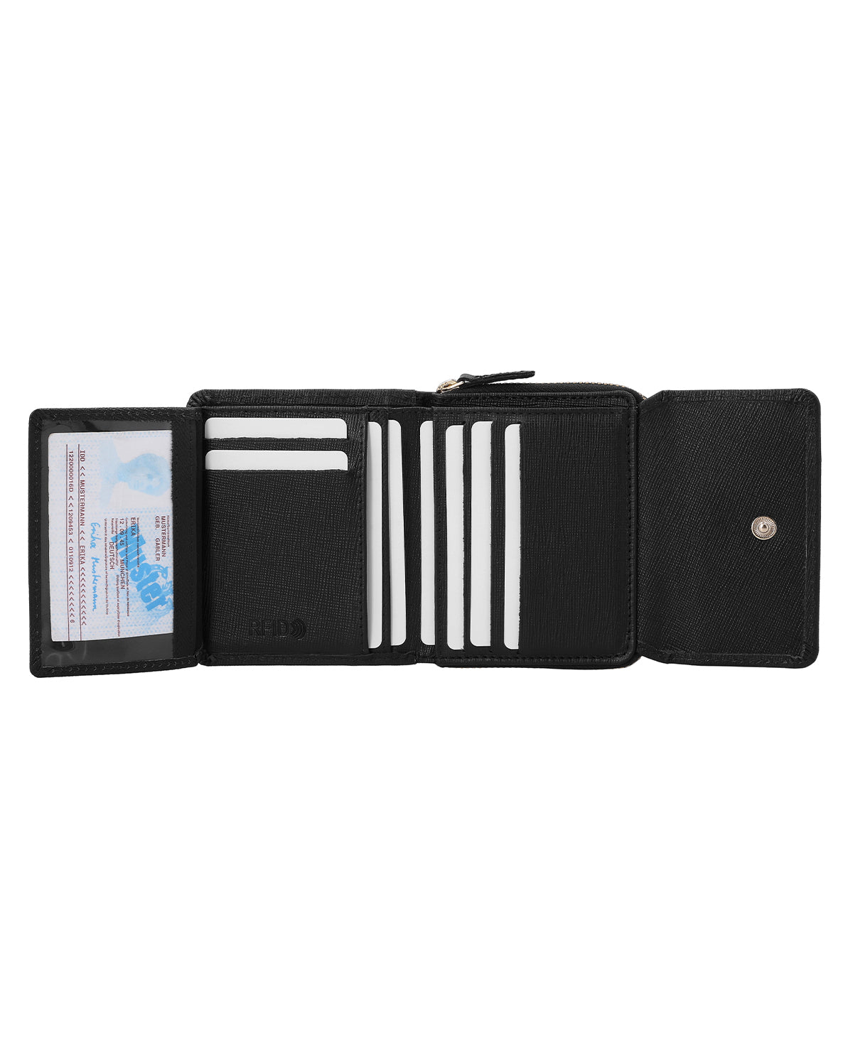 Im Inneren verfügt „Brigitta" über ein Geldscheinfach,ausklappbarem Sichtfenster, Platz für bis zu 6 Karten und ein separates Münzfach, welches per Reißverschluss abgeschlossen wird. So purzelt es nicht ungehindert in die Tasche. Aus hochwertig verarbeitetem Rindsleder im Saffiano Design wird das Portemonnaie mithilfe eines Druckknopfs verschlossen. Ab in die Tasche es kann losgehen – mit Brieftasche „Brigitta"!