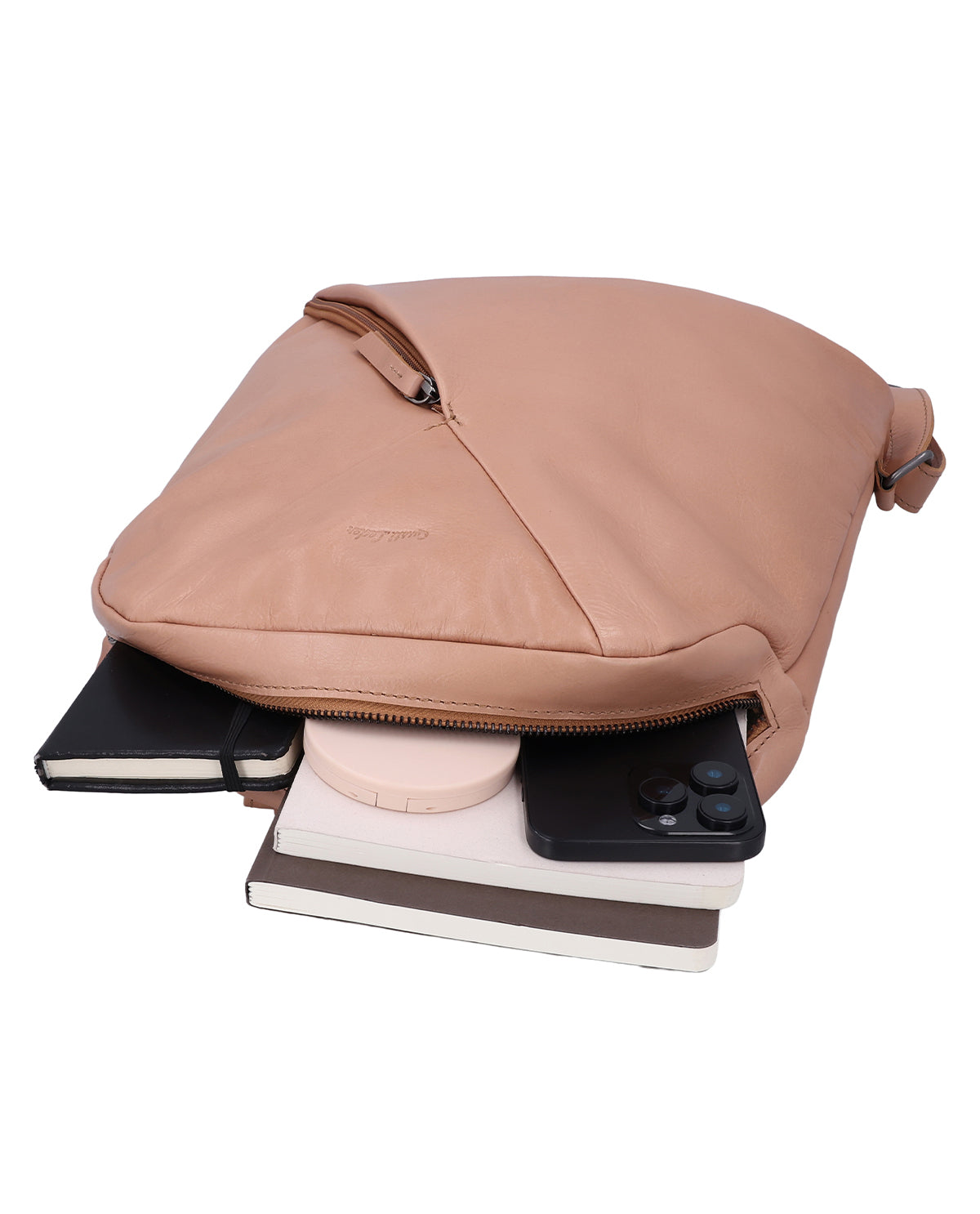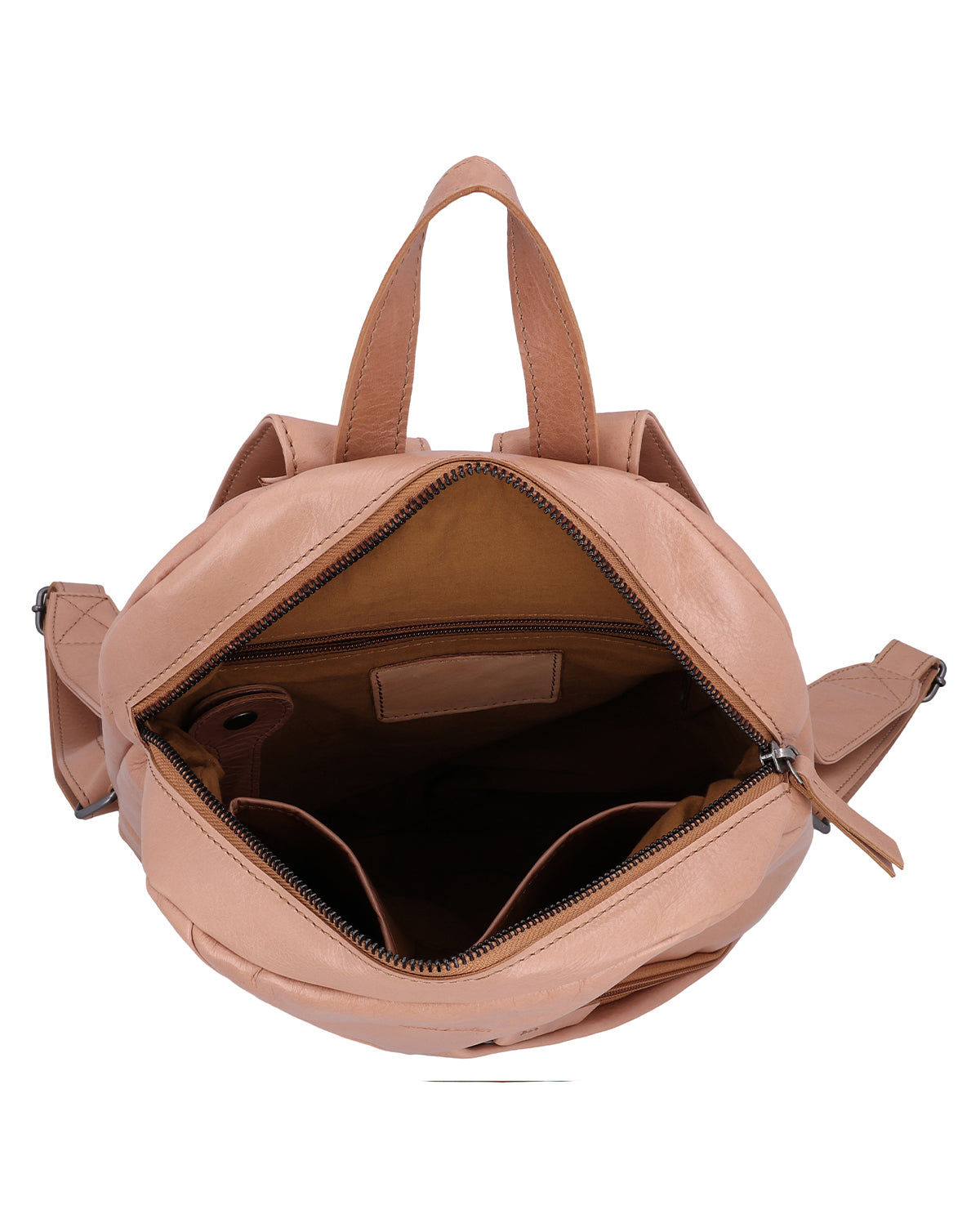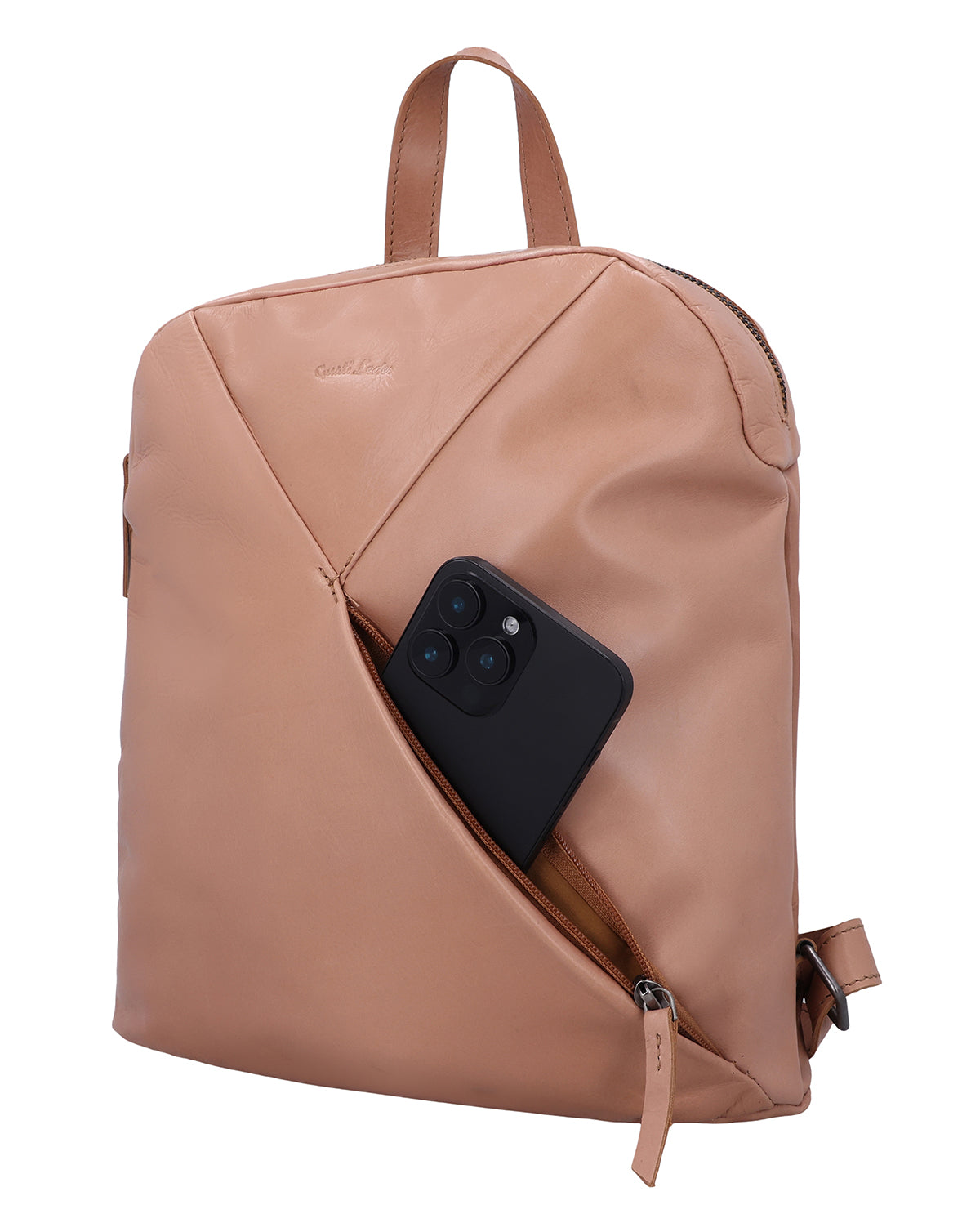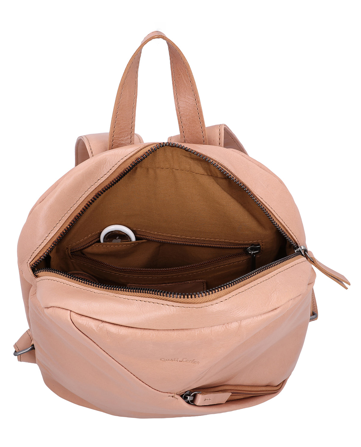 Innen bietet „Sanna“ Dir eine übersichtliche Aufteilung: Steckfächer für Kleinigkeiten, die Du schnell greifen möchtest, und ein Reißverschlussfach für alles, was etwas geschützter liegen soll. Auch außen bleibt es praktisch – ein Außenfach mit Reißverschluss ist ideal für Dinge, die unterwegs oft in der Hand sind. Die verstellbaren Schulterriemen sorgen für komfortables Tragen, und ein Gravur-Patch gibt Dir die Möglichkeit, „Sanna“ persönlich zu veredeln. Ein großer Lederrucksack für Damen, der Struktur schafft, ohne steif zu wirken.