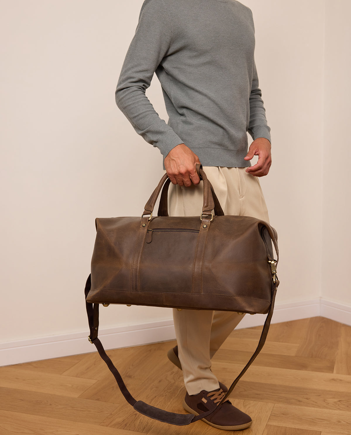 Have you got a weekend trip coming up but you don’t want to take a huge suitcase with you? Then we recommend our travel bag “Ruben”. The thick leather is sturdy and has a high-quality finish which means “Ruben” can be your travel companion for years to come. The simple vintage design speaks volumes about this travel bag, which is sure to turn heads at train stations and airports around the world. This leather hand luggage is a casual, chic accessory.