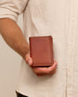 Our wallet “Arjen” has three sections that hold up to six cards, cash, and change. There's a coin pocket in the middle, secured with a press button, for your change, as well as card slots on either side for your credit cards, loyalty cards, and more. At the back of the wallet, you'll find an additional pocket for your cash and receipts. Keep your cash, cards, and coins safe by folding up this wallet. “Arjen” is made from sturdy goatskin leather that just gets better with age. You'll be able to enjoy his natural charm for years to come.