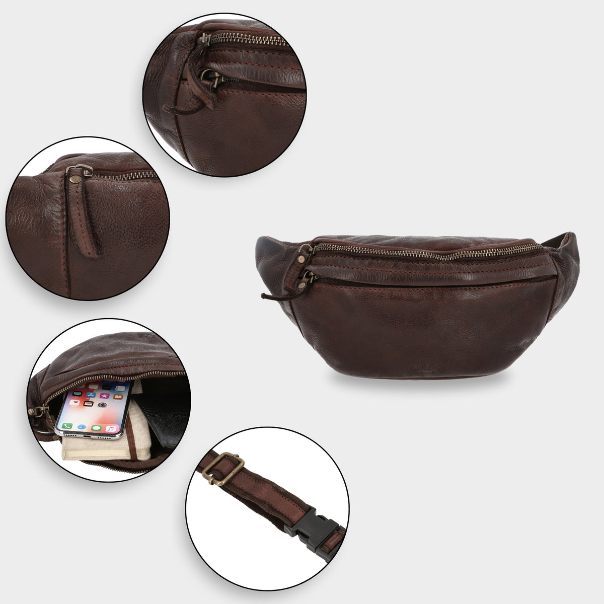 Our simple, no-fuss belt bag “Spencer” will win you over with its minimalist design, quality, and functionality. The high-quality processed cowhide leather means this belt bag is strong and sturdy. It has multiple zipped pockets where you can keep your festival essentials safe. Experienced festival-goers and concert lovers will really appreciate this bag's robustness. There's plenty of space for your wallet, phone, keys and more inside. Adjust this bag to fit you perfectly using the adjustable strap and sturdy buckle. Wear “Spencer” over your shoulder or round your waist, whatever suits you. Our motto is: “Spencer” is simple. Practical. Good.