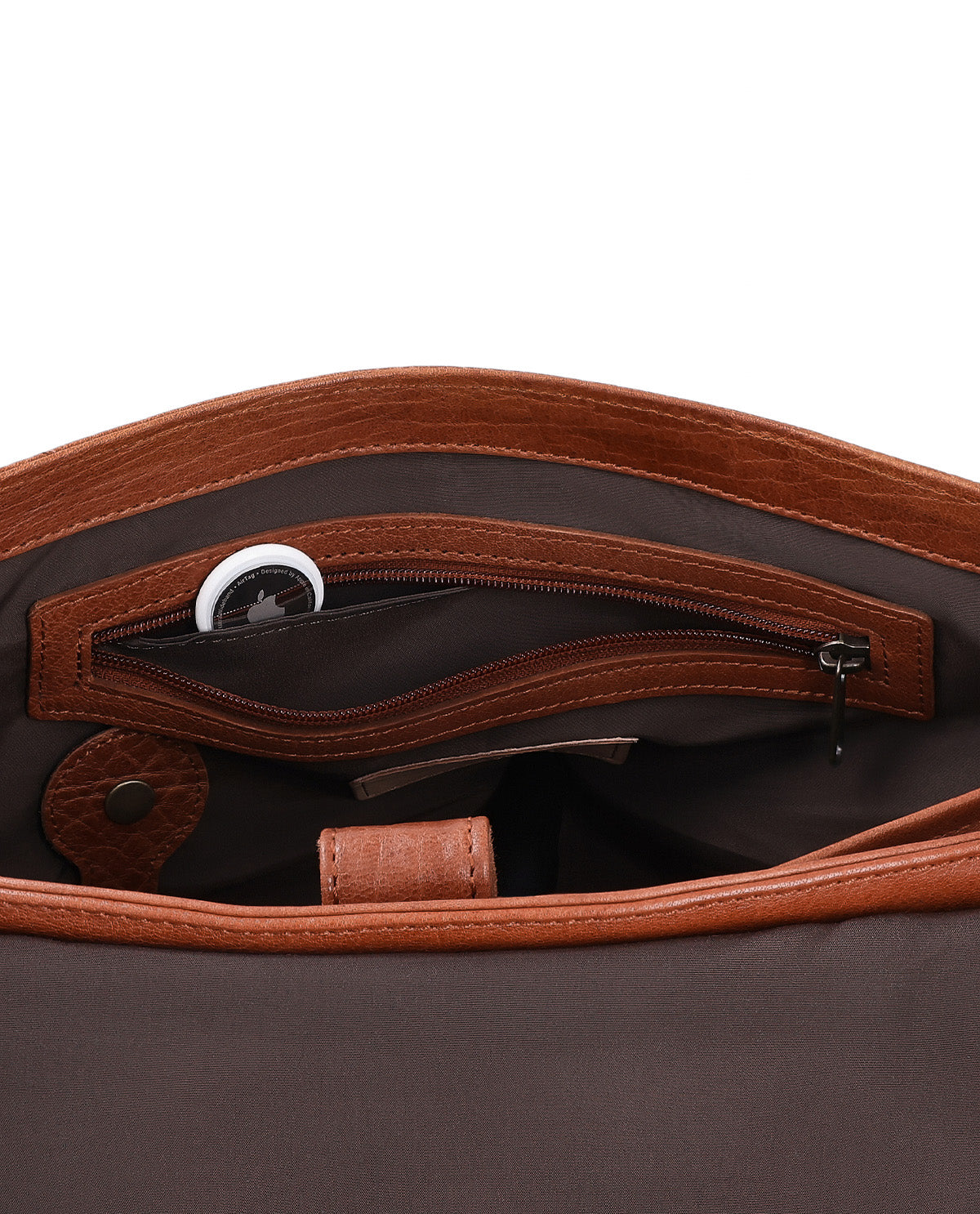 The Florin briefcase is a well-designed leather business bag for men and women who want flexibility in their everyday lives. An integrated AirTag compartment provides additional security, while an additional strap has been specially designed to keep the bag securely in place when cycling. This means that Florin stays reliably in place even when you're on the move. A practical key holder helps you keep your most important essentials within easy reach, complemented by a secret zippered compartment on the side for items you want to store discreetly. This leather laptop bag combines mobility, security, and clear structure.