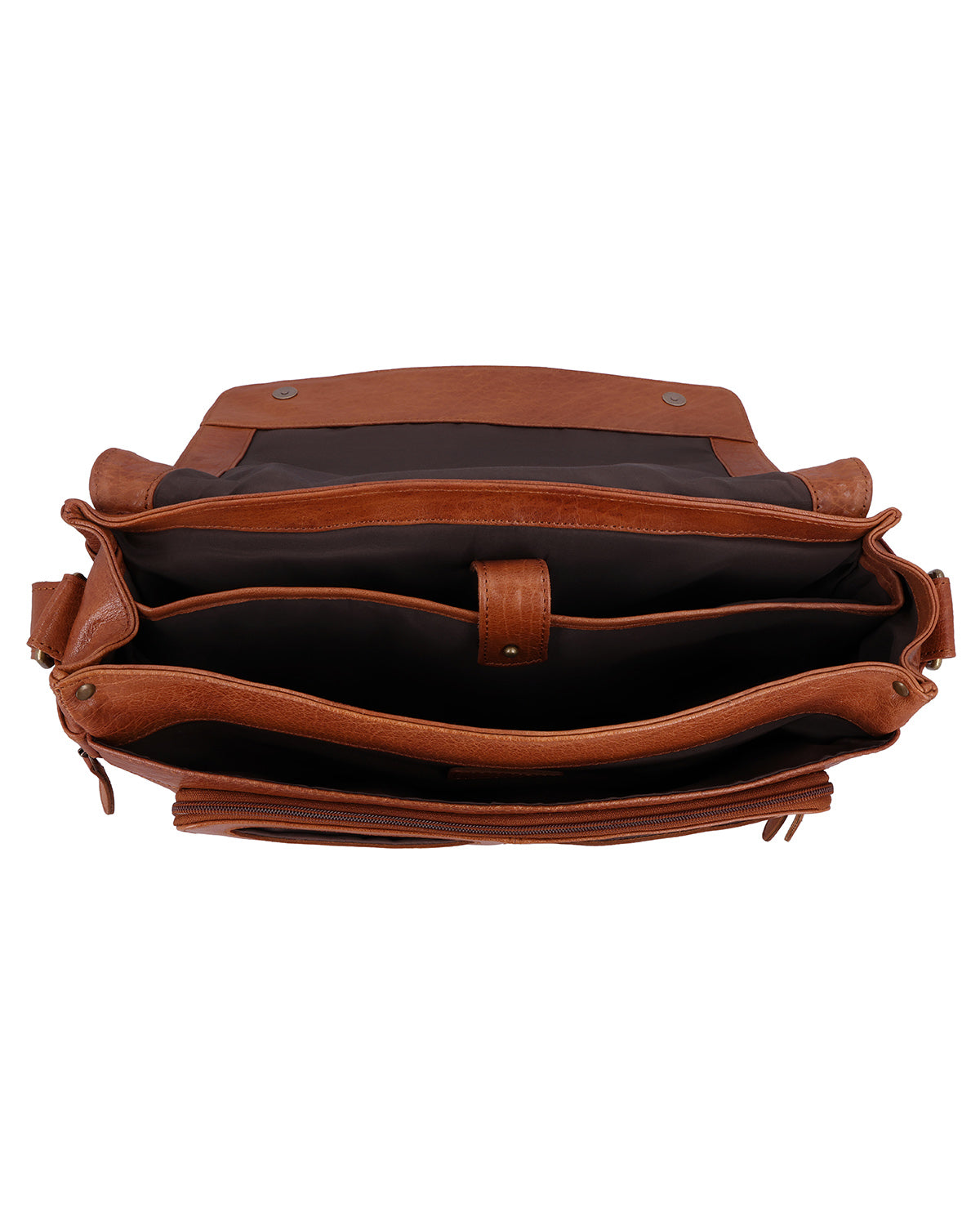 Two outer slip pockets and a large outer compartment with a zipper provide quick access to documents and accessories. Inside this compartment, several concealed zipper pockets, a snap-fastener pocket, a slip pocket, and two pen holders keep everything tidy. A separate laptop compartment reliably protects your device, complemented by a zipper pocket in the main compartment and another pocket on the back of the bag. The shoulder strap is adjustable and adapts to your everyday needs, while the magnetic closure allows for quick opening and secure closing. An engraved patch and the Gusti logo on the inside and outside round off "Florin" as a high-quality leather business bag.