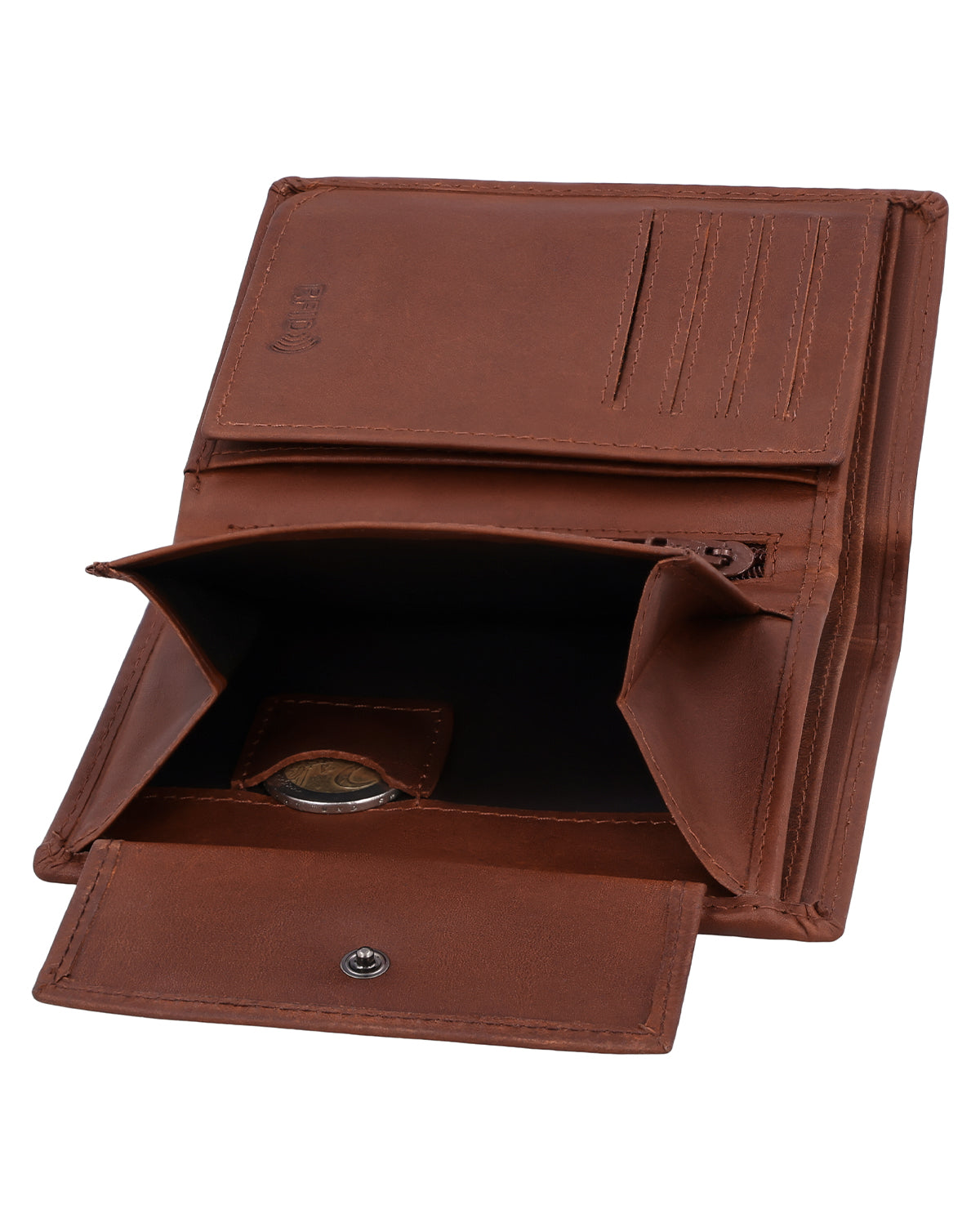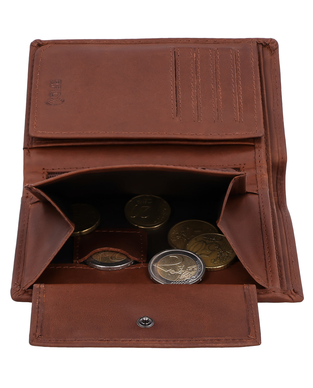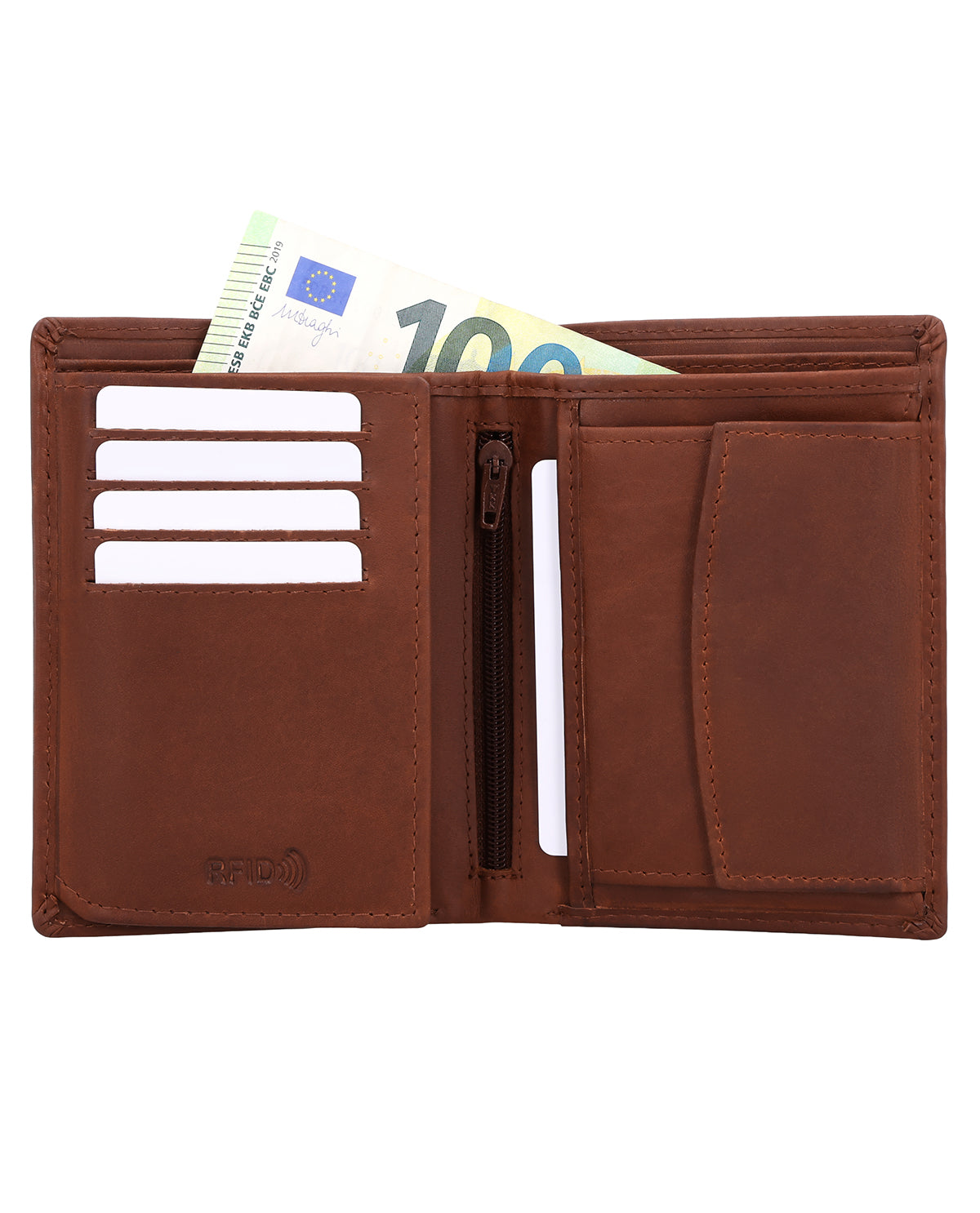 Despite its compact shape, the interior of the leather wallet surprises with a spacious and clearly structured layout consisting of two bill compartments, a separate coin compartment that can be opened with a snap fastener, and 8 slots for (at least) as many cards. In the coin compartment, you will also find an extra coin compartment for a 1-euro coin, which is ideal for shopping carts or lockers. An additional integrated flip compartment expands the wallet with a large viewing window, in which you can easily store your ID, driver's license, or even photos of your loved ones. Another nice-to-have feature is the small zippered compartment, which can be used to store very special valuables, as well as the two side pockets behind the coin and card compartments.