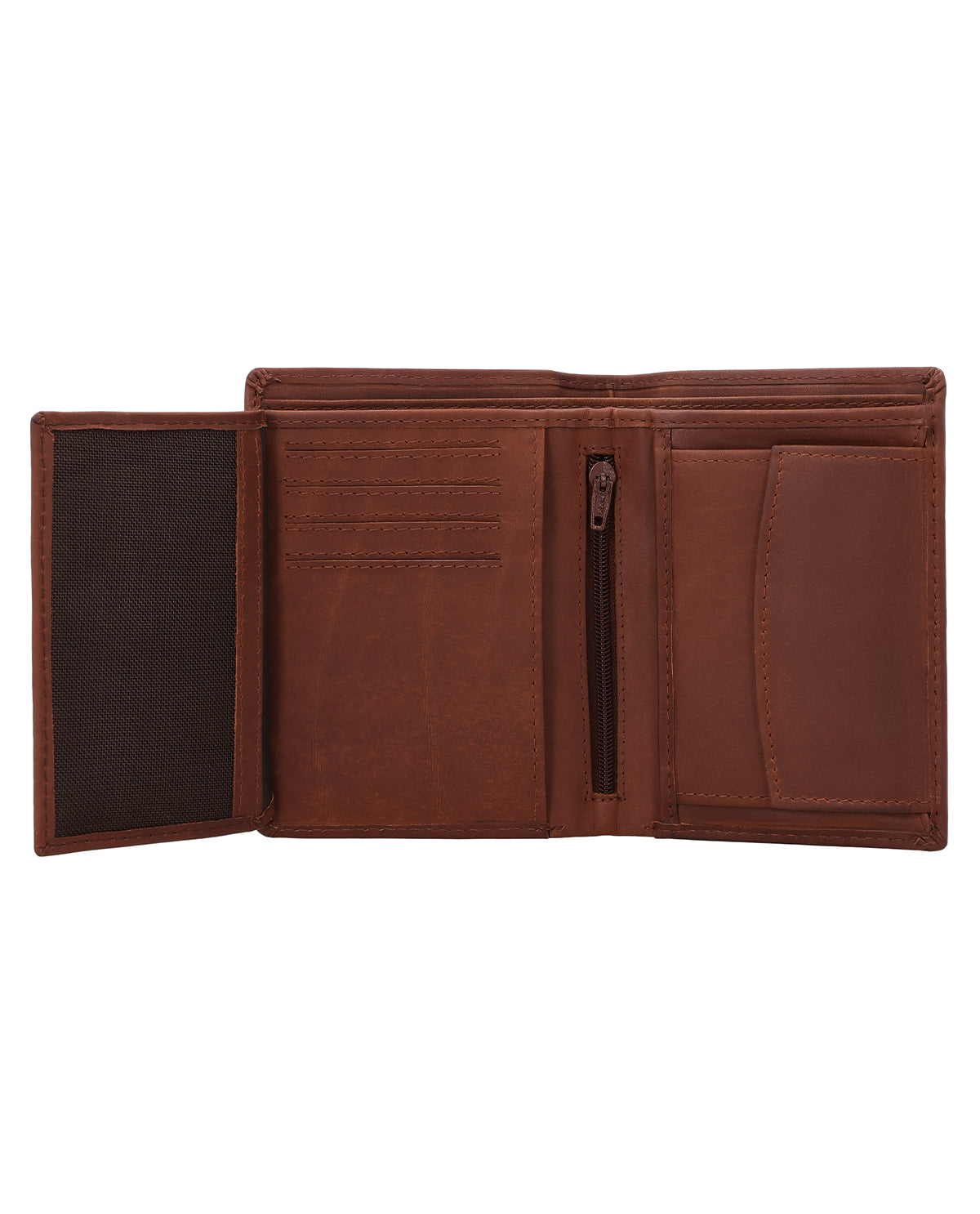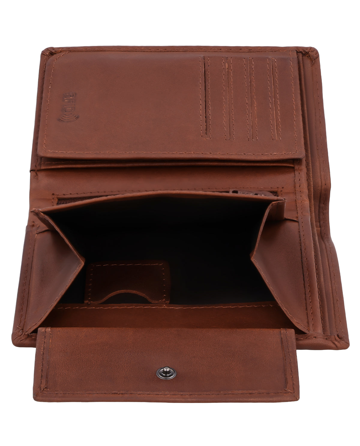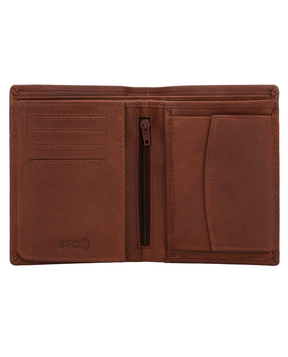 Despite its compact shape, the interior of the leather wallet surprises with a spacious and clearly structured layout consisting of two bill compartments, a separate coin compartment that can be opened with a snap fastener, and 8 slots for (at least) as many cards. In the coin compartment, you will also find an extra coin compartment for a 1-euro coin, which is ideal for shopping carts or lockers. An additional integrated flip compartment expands the wallet with a large viewing window, in which you can easily store your ID, driver's license, or even photos of your loved ones. Another nice-to-have feature is the small zippered compartment, which can be used to store very special valuables, as well as the two side pockets behind the coin and card compartments.