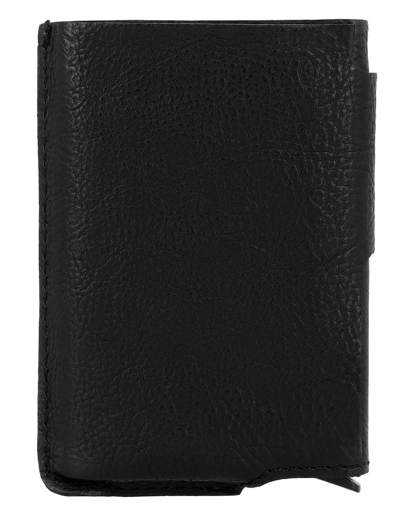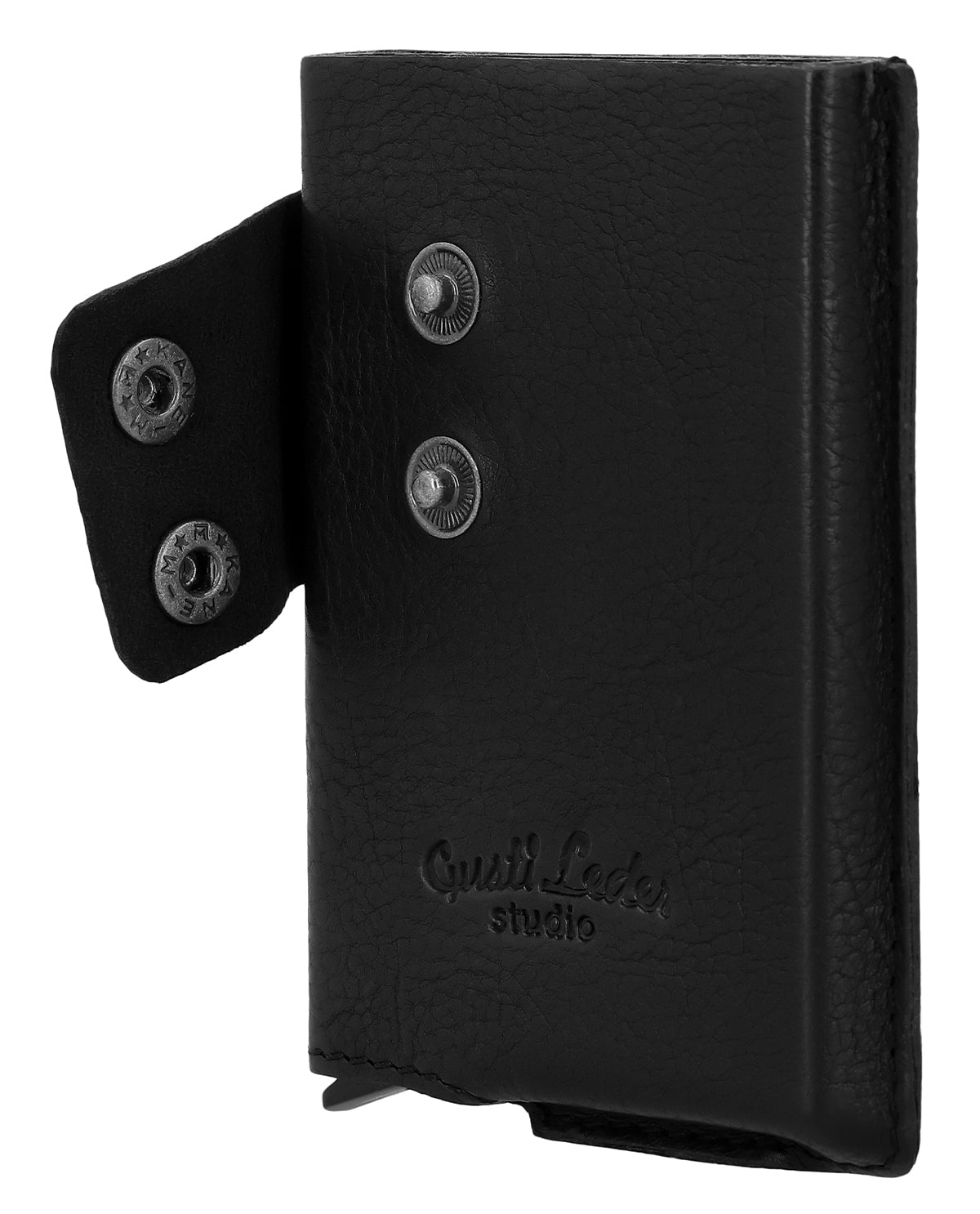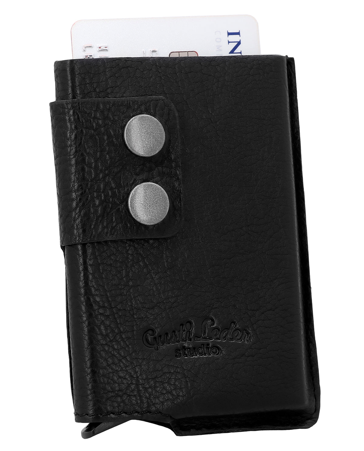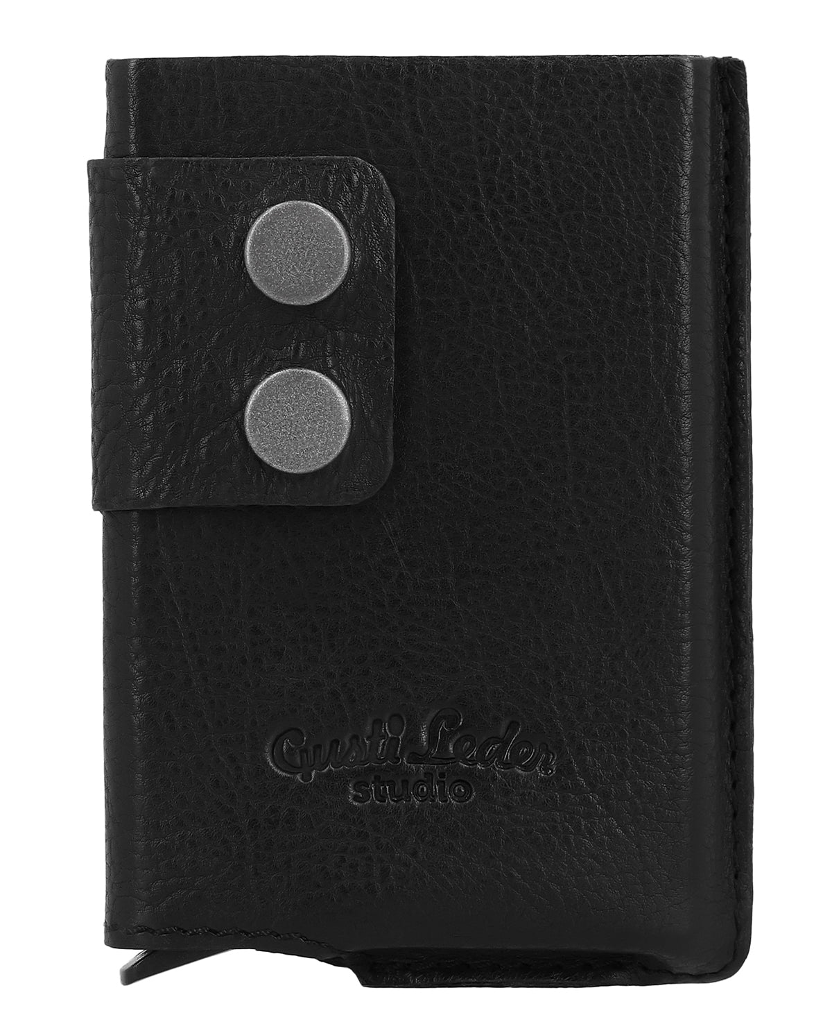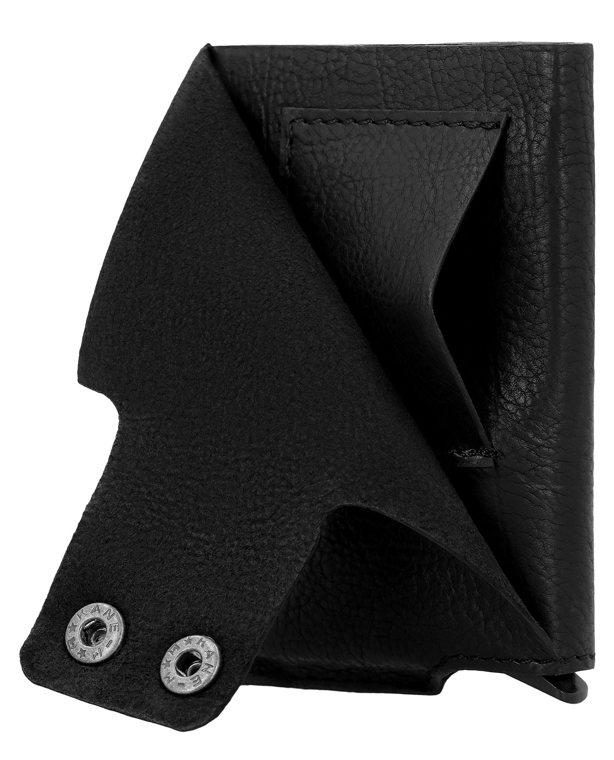 The black "Tilo" wallet is a men's wallet that combines security and clear structure. Two snap fasteners ensure a secure hold and safe closure for everyday use. The integrated automatic pop-up mechanism brings your cards up clearly at the touch of a button and allows quick access. "Tilo" has a minimalist, functional design and fits easily into any pocket.