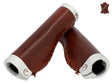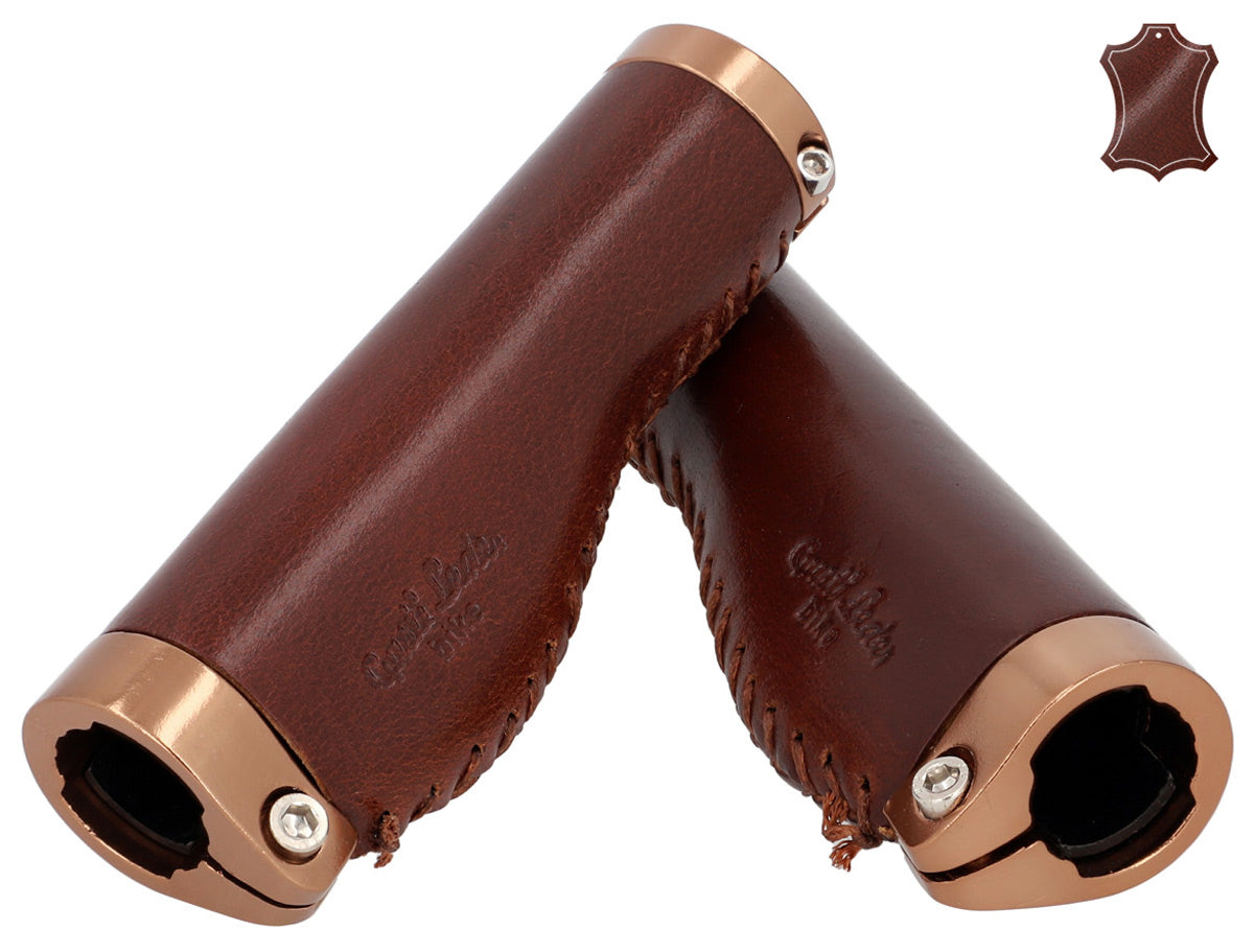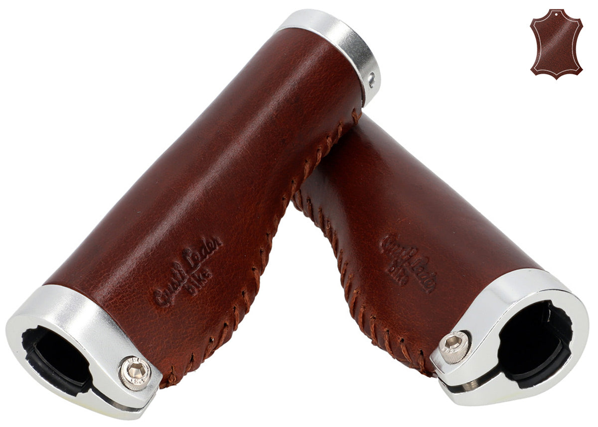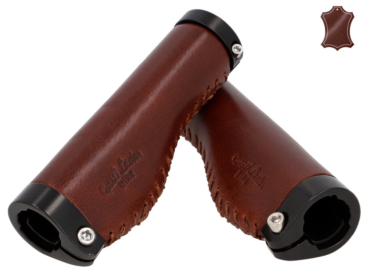 De leren handvatten "Phil A." passen optisch net zo goed bij een trendy single-speed fiets als bij een klassieke Hollandse fiets en zijn eenvoudig te monteren. Hun hoogwaardige materiaalcombinatie van gekleurd aluminium en 100% echt leer zorgt voor uitstekende grip en een constant goede stuurgedrag. Tegelijkertijd passen ze zich ideaal aan de anatomie van je handen aan, dempen schokken en trillingen en verhogen zo de gripveiligheid. Na een korte inrijperiode wil je het voelbare comfort en de aangename aanraking van deze handvatten niet meer missen.