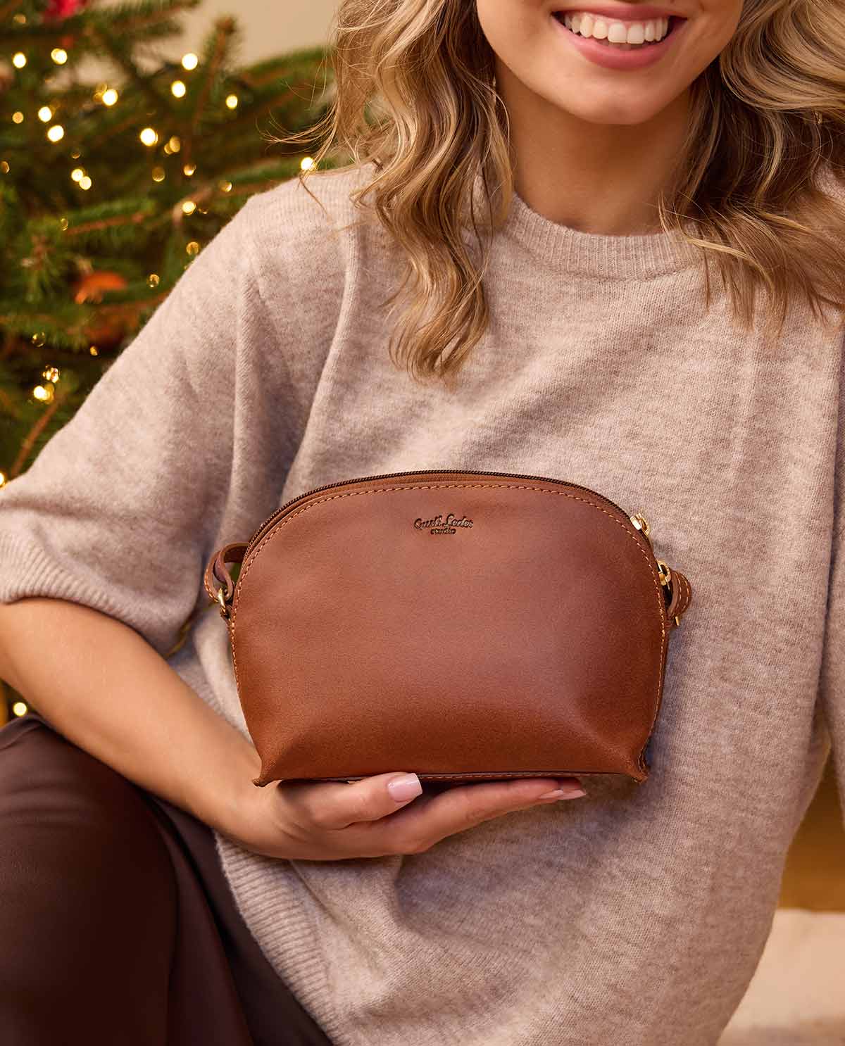 Deze stijlvolle handtas van stevig en duurzaam bruin rundleer combineert door haar halfronde vorm met de afgeplatte bodem en de opvallende goudkleurige twee-weg ritssluiting als geen ander stilistische tegenstellingen met elkaar en zorgt ervoor dat "Tilda" altijd perfect te combineren is en voor alle gelegenheden past. Een extra pluspunt op het gebied van veiligheid: een in de gestreepte voering van de tas geïntegreerd ritsvak voor sleutels, smartphone of de kleine portemonnee – voor nog een beetje meer veiligheid en optimale bescherming van je eigendommen tegen zakkenrollers.