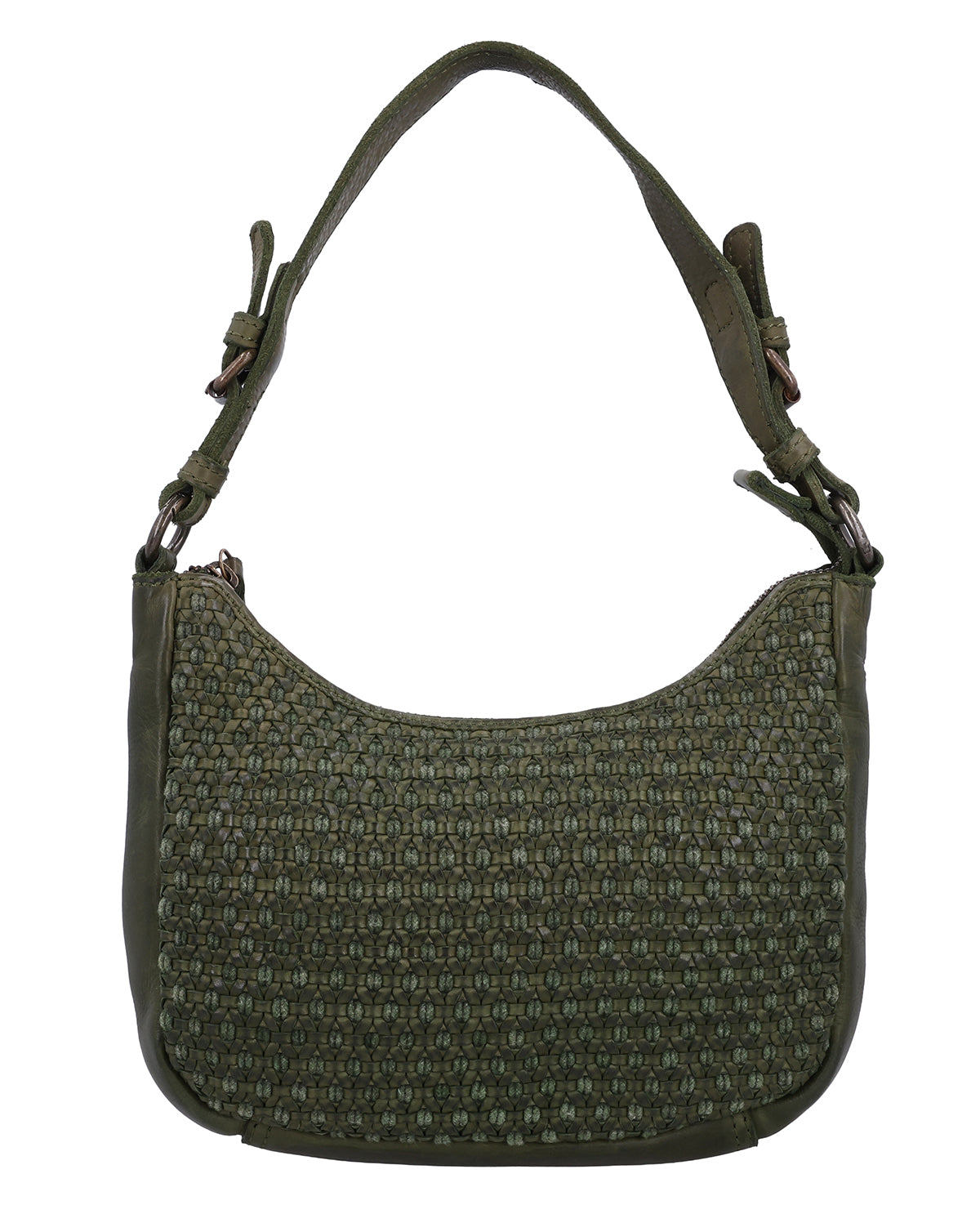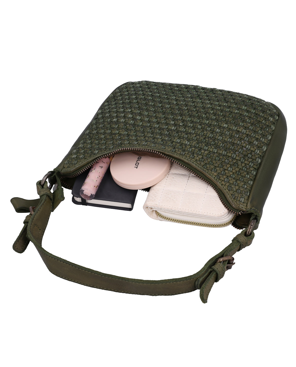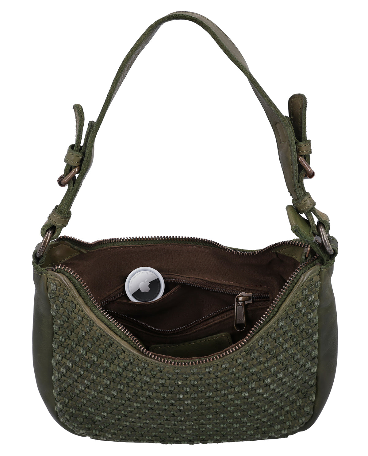 De kleine handtas "Darina" is een groene leren handtas voor dames die meteen opvalt door zijn gevlochten patroon. Het gestructureerde ontwerp geeft de tas een bijzondere diepte en maakt hem tot een stijlvolle metgezel voor dagelijks gebruik en vrije tijd. Een verborgen AirTag-vak zorgt voor extra veiligheid, terwijl een afneembare sleutelhanger je essentials binnen handbereik houdt. Eén hoofdvak met ritssluiting beschermt je spullen goed en dankzij twee verstelbare en afneembare draagriemen kun je "Darina" flexibel aanpassen aan je stijl.