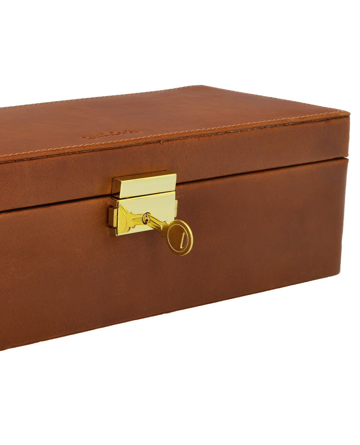 Met "Marcel" berg je je favoriete horloges veilig, elegant en stijlvol op. De horlogedoos van hoogwaardig leer met een glad, edel oppervlak combineert een veeleisend design met functionele verfijning. De luxe buitenkant geeft hem een tijdloze uitstraling, terwijl de zachte, met stof gevoerde binnenkant je horloges goed beschermt tegen krassen en stof. Met zijn strakke lijnen en warme leerstructuur is "Marcel" niet alleen een handige opbergplaats, maar ook een decoratief hoogtepunt op elk nachtkastje of plank.