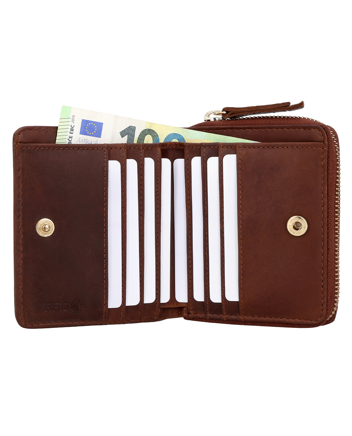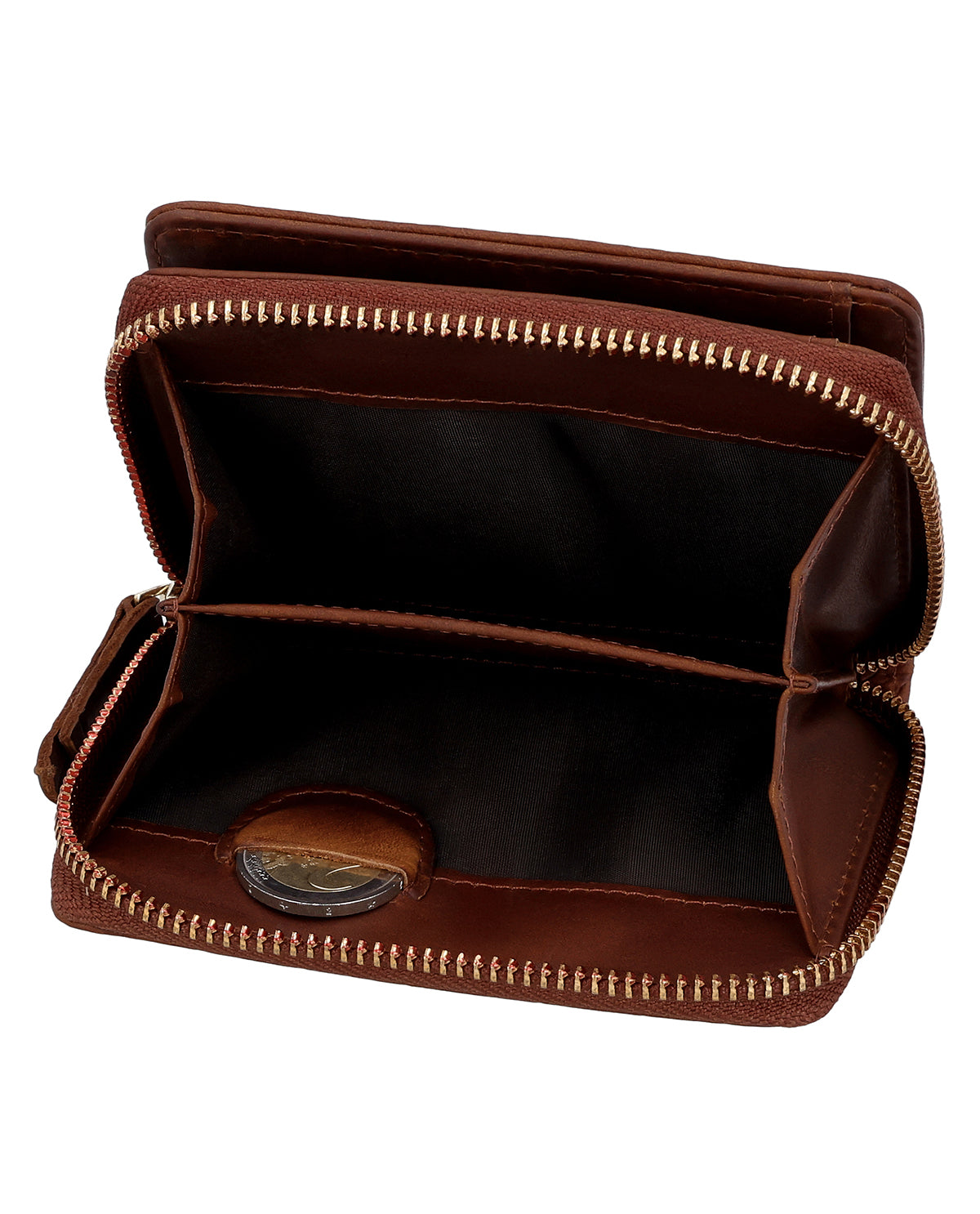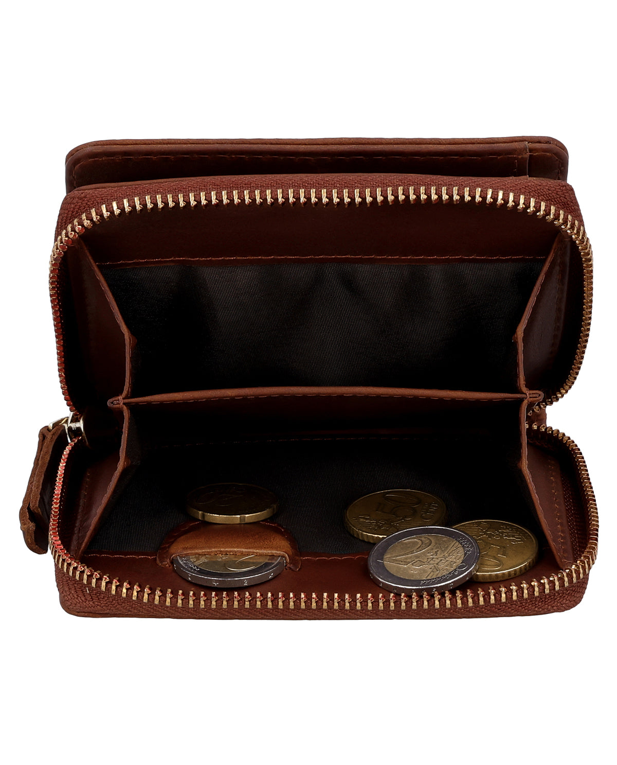 Aan de binnenkant heeft "Monika" een groot muntvak met twee compartimenten, zodat je zoveel mogelijk ruimte kunt benutten. Daarnaast is er een extra muntvak voor een enkele munt – perfect als je snel een passende munt bij de hand wilt hebben. Maar het hoogtepunt is zeker het opklapbare kaartvak met ruimte voor maximaal 8 kaarten en een insteekvak voor je bankbiljetten. De grote ritssluiting beschermt je spullen perfect, zodat er niets uit kan vallen. In je tas en gaan – met "Monika"!