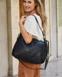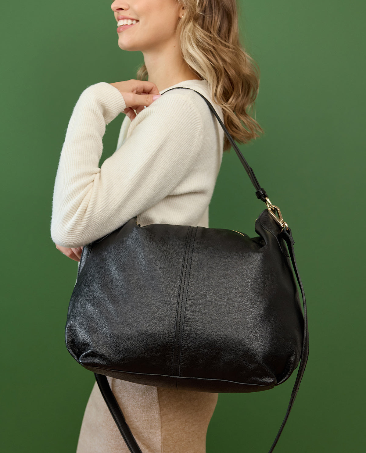 Ben je op zoek naar een klassieke shopper, die je niet in de regen laat staan? Dan is "Hannah" precies jouw ding. Deze middelgrote schoudertas is gemaakt van stevig en resistent buffelleer in een gedistingeerde zwarte kleur. Zo ben je helemaal trendy en heb je dankzij het ruime binnenvak toch genoeg ruimte voor alles wat je tijdens een wandeling door de stad of tijdens je werkdag nodig zou kunnen hebben.