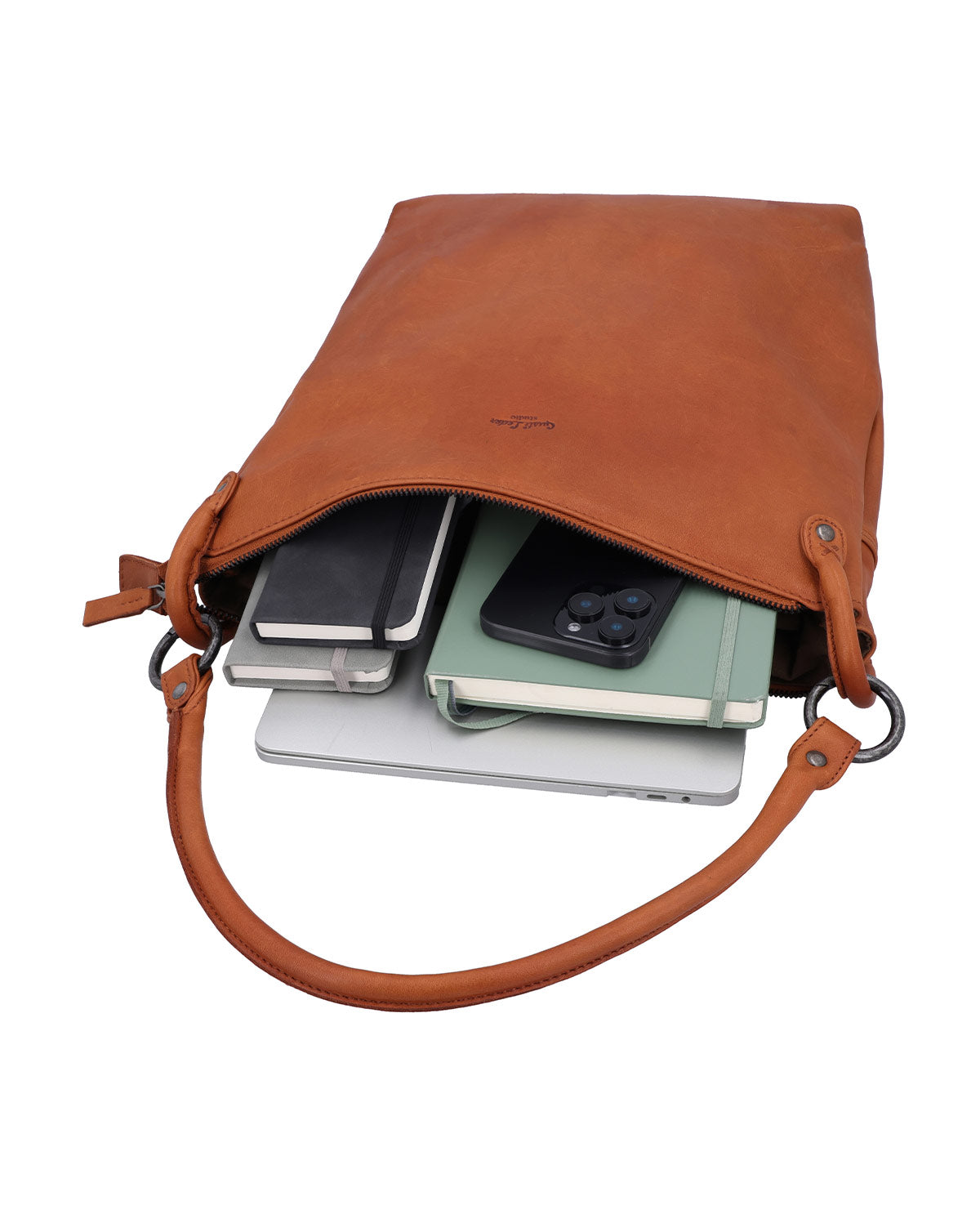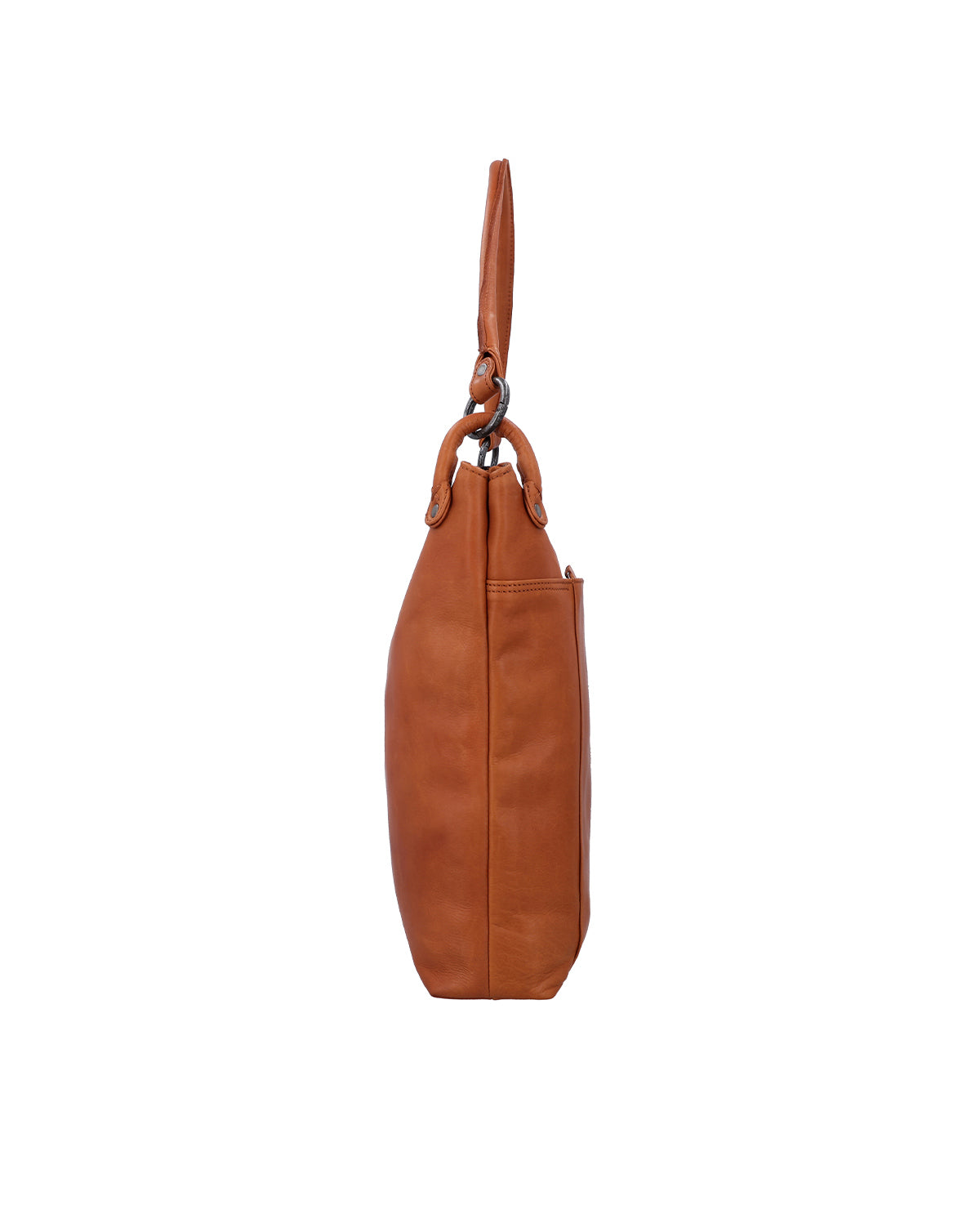 De "Cathy" Shopper is de perfecte mix van praktische functionaliteit en elegant design. Gemaakt van hoogwaardig bruin leer, overtuigt ze met robuuste, ronde handvatten die versterkt zijn met metalen ringen en voorzien van een X-gestikt leerdetail. De ritssluiting met leren trekker zorgt ervoor dat je persoonlijke spullen altijd veilig en beschermd zijn. Het ruime binnenvak, dat is gevoerd met duurzaam katoen, biedt voldoende ruimte voor alles wat je dagelijks nodig hebt.